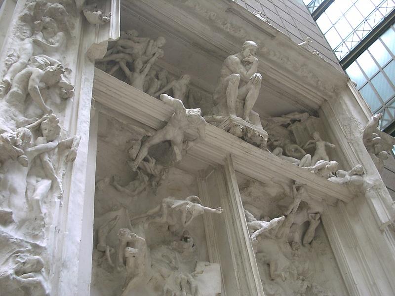 Struggle also is the theme of Rodin´s major work, The Gates of Hell. This work was conceived as a monumental door for a Museum of Decorative Arts in Paris that should be erected on the Cour des Comptes, ravaged in 1871. By decree of 16 August 1880, the Directorate of Fine Arts commissioned Rodin, who suggested the decorations should be based on Dante´s Divina Commedia. During his visit to Italy, he had seen Ghiberti´s Gate of Paradise in Florence; his own door should become its counterpart. Later, Rodin decided to divide the door into various sections or leafs after the example of Michelangelo's Last Judgement in the Sistine Chapel. The Gates feature the fate of Francesca, the daughter of Guido da Polenta, who had fallen in love with Paolo Malatesta, the younger brother of her husband Gianciotto, Lord of Rimini. Caught and stabbed by Francesca´s jealous spouse, the couple is sent to Hell and dwells among a whole range of other sinners, squirming and writhing in anguish. |