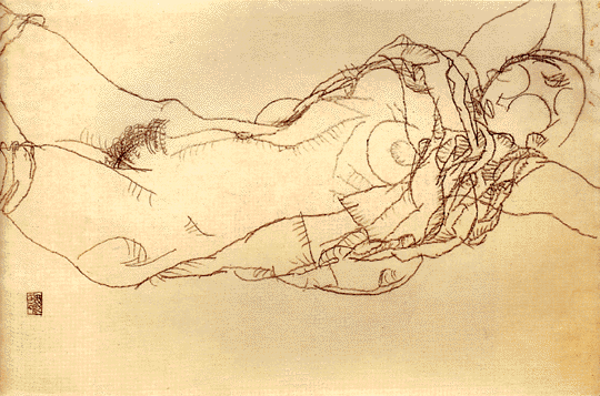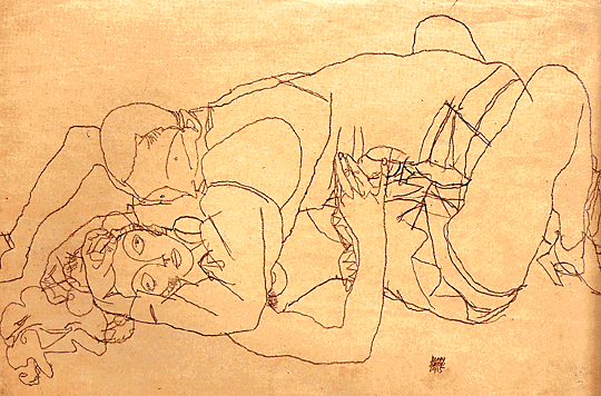 Schiele's line, in fact, is fraught with self-reflection. In Reclining Woman with Raised Chemise (1914), or Kneeling Woman with Head Bent Forward (1915), Schiele tied his sensational subjects to the bedframe of self-consciousness. As his career progressed, his line became claustrophobic, strangulating. Consider the study for Act of Love (1915) -- it's as if he were transforming the silent commotion of sexual intercourse into an analysand's monologue. His pictures collapse into the chasm between his divided intentions: he wants to shock and titillate through the depiction of sexuality, but he cannot escape his own tormented self-consciousness about sexuality. |