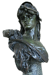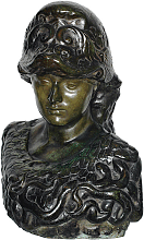 A very similar composition - but lacking the belligerant facial expression - is titled 'Pallas wearing a casque'; a bronze cast can be found in the Musée Dr Faure in Aix-les-bains, France.