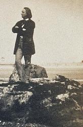 Finally, a marble sculpture of the Poet, resting on the rocks of the island of Guernsy, without any Muses, was carved to be exhibited as the centerpiece of the Salon of 1901. With the support of Dujardin-Beaumetz, this marble version was finally placed in the gardens of the Palais-Royal on a pedestal of uneven stone slabs in 1909, where it stayed till 1933; later, it was removed to the Musée Rodin. Rodin's Project as an execution of Hugo's self-erected monument The two photos above (left and middle), made in 1853 during Hugo's exile by his son Charles, must have been familiar to Rodin; Hugo had deliberately directed their shooting as an essential part of his poetic and political message and published them in order to project his own myth. As a consequence, by the time Rodin designed the first version of his 'Monument', the image of the visionary poet, immune to political corruption, listening to the wind, the sea and the voice of the stars (like in Hugo's poem 'Stella') while resting on the Guernsy rocks as his pedestal, already had become a visual commonplace: Le poète est également celui qui éclaire les peuples par la parole, ici la poésie dont le lyrisme s’accorde avec celui des photographies. Ainsi Hugo a-t-il lui-même et consciemment façonné son propre mythe. Dans les décennies suivantes, illustrateurs et caricaturistes réutiliseront l’image de Hugo sur son « piédestal », véritable statue vivante. [Stéphanie CABANNE - read the full article here] In this sense, Rodin's composition was not solely based on his own inspiration, but to a certain degree the execution of the poet's own imagined monument, in clay, plaster and marble. The revival of a forgotten Design Rodin's 1897 model sank into oblivion. Only in 1950, when Victor Hugo´s 150th anniversary, the year 1952, was nearing, the City of Paris, looking for a suitable monument, thought of Rodin's attempts again, and commissioned a bronze cast from a model Ruth Butler describes as a: "... three-figure plaster in the Musée Rodin, a work that had so been out of view for the past fifty years that it was neither mentioned nor illustrated in the official catalogue of the museum, a catalogue considered as nearly complete"